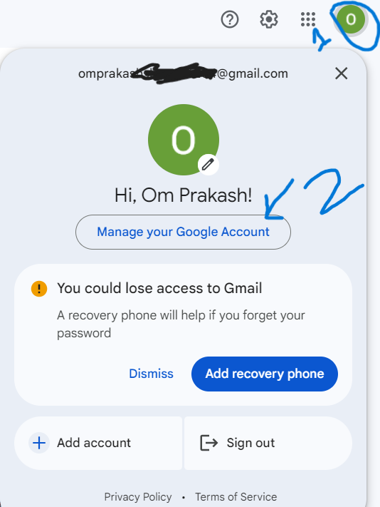 - उसके बाद आपको अपने जीमेल प्रोफाइल वाले ऑप्शन पर क्लिक करके Manage Your Google Account वाले ऑप्शन पर क्लिक करना है